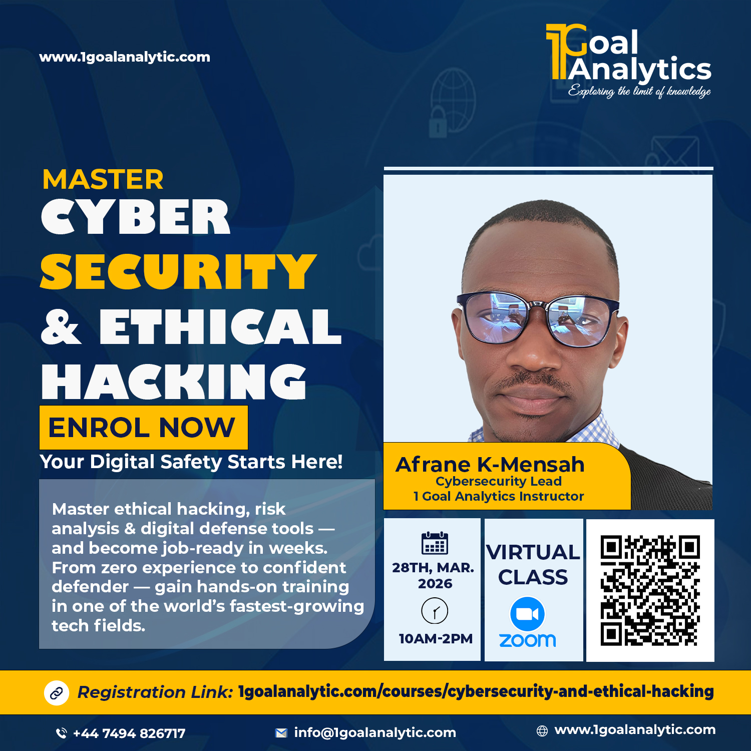 This training provides skills required for first line of security support. You will learn how to contribute to the delivery of a security culture across an organisation, understanding vulnerability and threats and supporting the development of an organisation’s cybersecurity maturity. 1 Goal Analytics has collaborated with industry to create a program that trains candidates specifically for the roles such as Cyber Security Analyst, Information Security Manager, Cyber Security architect, Network Security Engineer, IT Security Consultant, Cryptologist, and Data Privacy Officer
